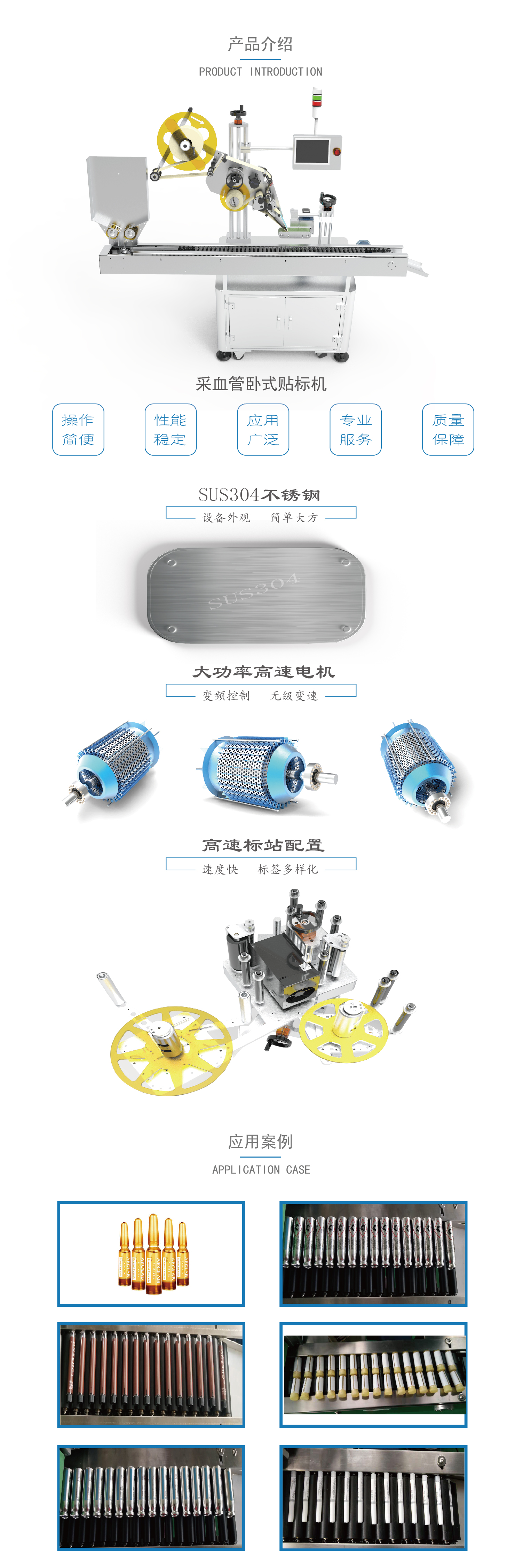 適用以下行業產品的全周或者半周的自動化貼標要求:制藥行業類,如安瓿瓶、口服液、采血管等產品;文具用品類,如筆桿、固體膠、漿糊筆等產品;化妝品行業類,如口紅、眉筆等產品;肉制品行業類,如火腿腸等圓形產品。 可選用工業視覺檢測物體的標簽是否有漏貼,對貼標物體的收集、打印三期等功能滿足; 本機型主要的材質為符合國際標準的SUS304不銹鋼和進口鋁合金材質,鋁合金的表面經過雙層陽極氧化處理,不生銹、不變形。
